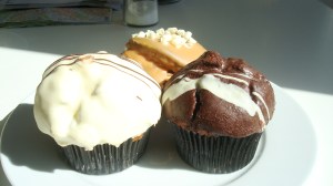 The muffins in the picture were Taffy Apple (apple muffin with a caramel topping), White Chocolate Blueberry (blueberry muffin with a white chocolate ganache topping) and Chocolate Chocolate (chocolate muffin with chocolate ganache topping)