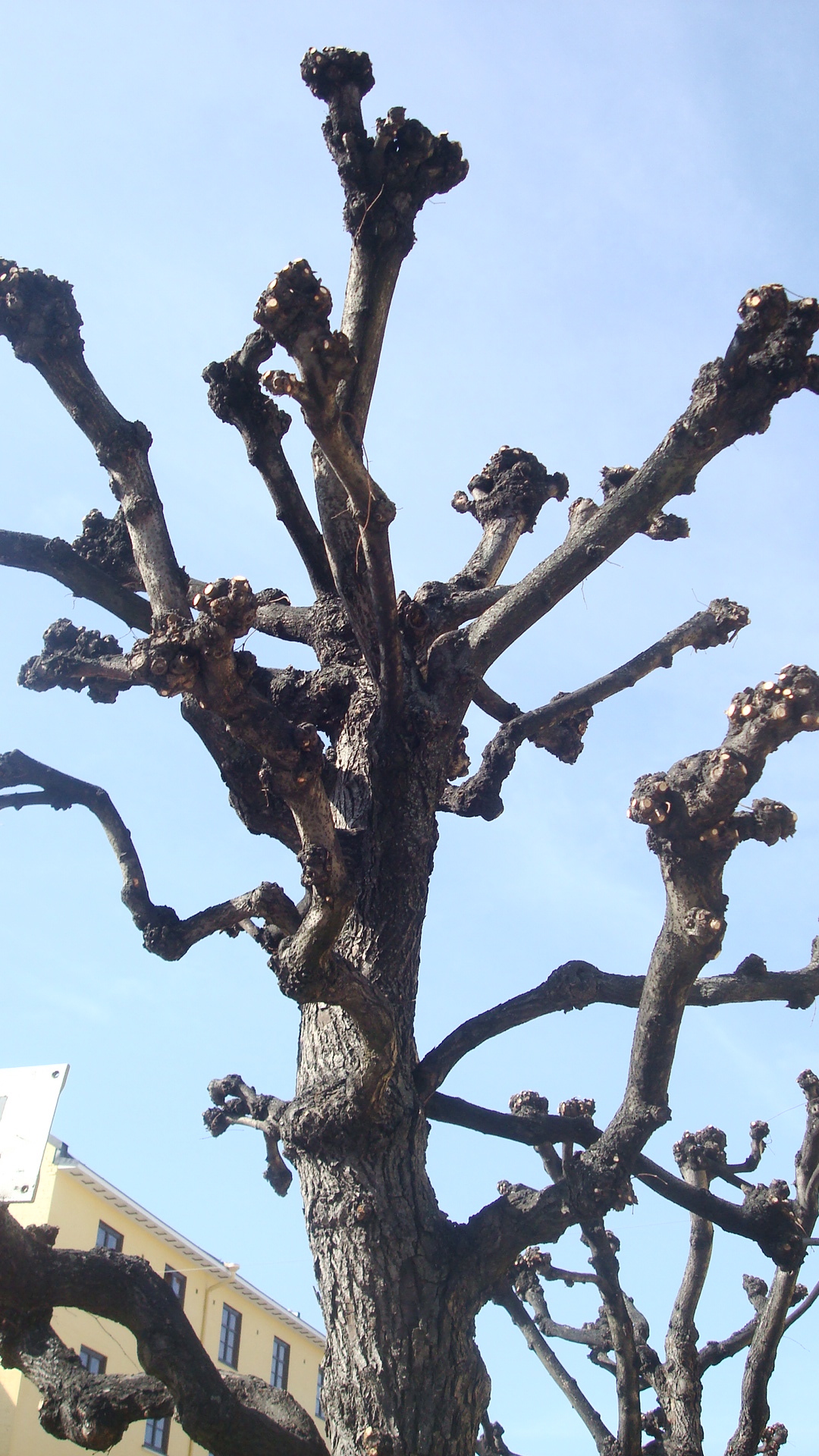 I did a little online research on that tree. I believe it is a linden tree that has been heavily pruned. Lindens are commonly used along streets in cities because they don’t bust up the pavement and adapt well to urban areas. I looked at the leaves and bark and it looks like a variety of linden. The trees have been excessively pruned which gives them that knotty knuckely look. That is my best guess anyway. I am so glad everything is going well for you two. I read all of your posts.