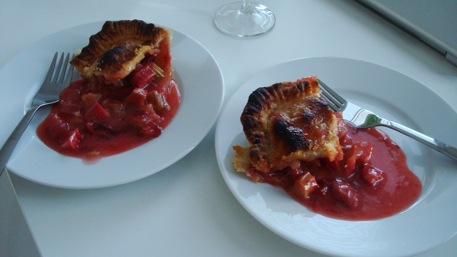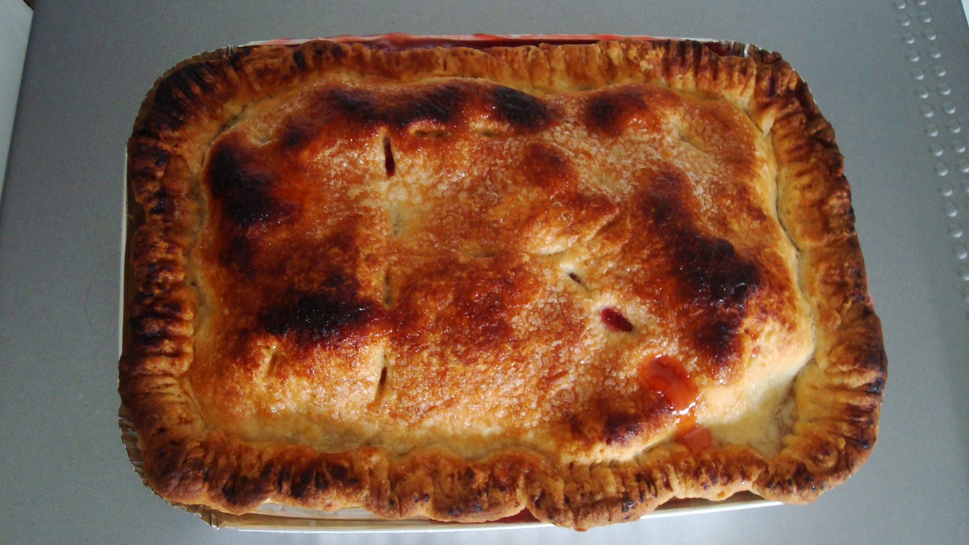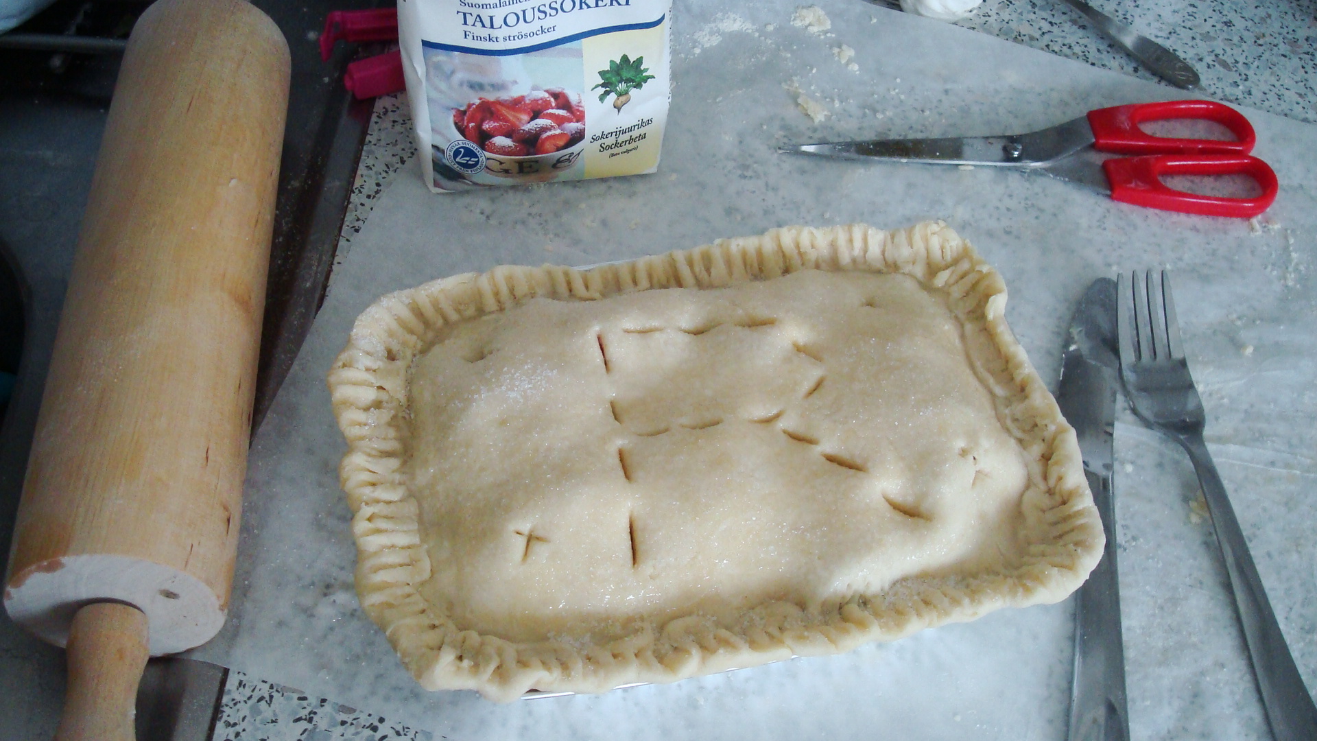 Tried my hand at baking today for the first time since we arrived in Finland. Had a helluva time finding everything I needed, and had to make a few adjustments. Since pie is not eaten here, none of the stores carry pie dishes, so I settled with a small bread-loaf dish. The biggest problem was finding shortening or lard for the pie crust. We asked several women in the market who all led us back to the butter, and we ended up coming home with a block of something that looked similar to lard. Using the fresh rhubarb and strawberries I got at the market, I threw together a pie.