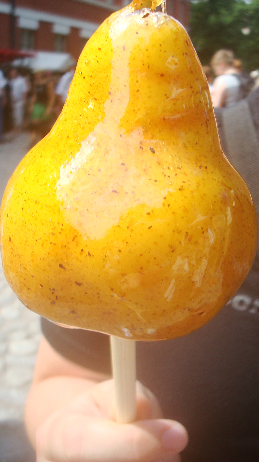 While it was neat to see people dressed in the garb and eat the grub, our favorite part of the entire festival was a pear on a stick. Mind you, this was no ordinary pear on a stick. This was a pear dipped in some kind of concoction that tasted like pure joy in your mouth. ย The coating was hard to peg. It looked like honey, tasted like cinnamon, vanilla and syrup, but was hard & crunchy and not sticky. I’ve never thought to dip a pear in anything before, but this combination was so delicious!