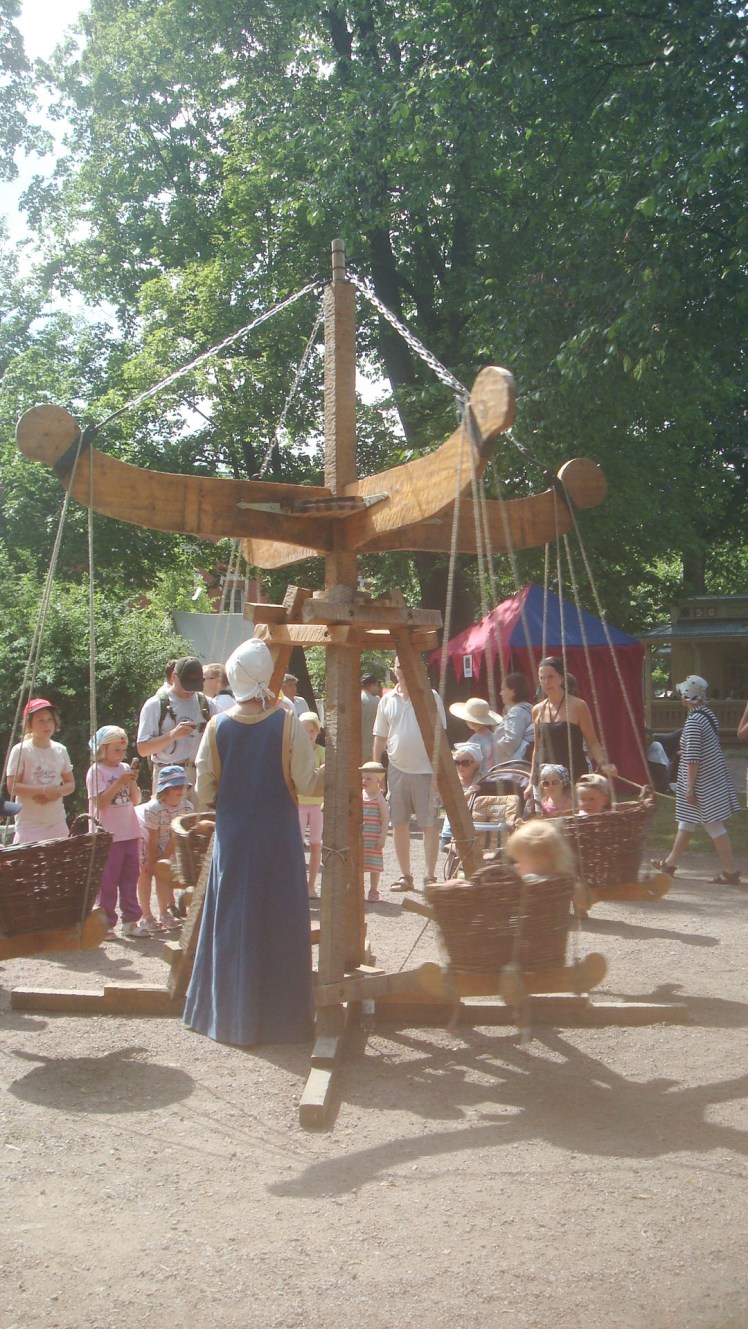 There were also medieval toys for the youngsters to play on sprinkled throughout the festival. This is a huge swing that spins 4 children at a time, while the woman in the middle cranked the center beam. (This entire vicinity stunk of puke, which was probably due to the unfortunate combination of the heat, fish-lettuce wraps and this swing)