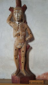 St. Sebastian along the walls of the Catholic church, as he is commonly depicted as tied to a post and shot with arrows (hence the holes)