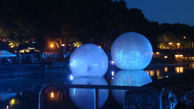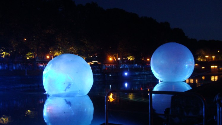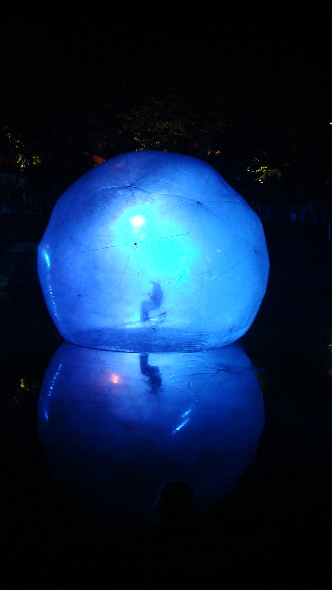 There were two spheres this time, one with a flutist the other with an acrobat. Because the glare from the river was so strong, it was difficult to see the acrobat swinging and flipping inside of their bubble.