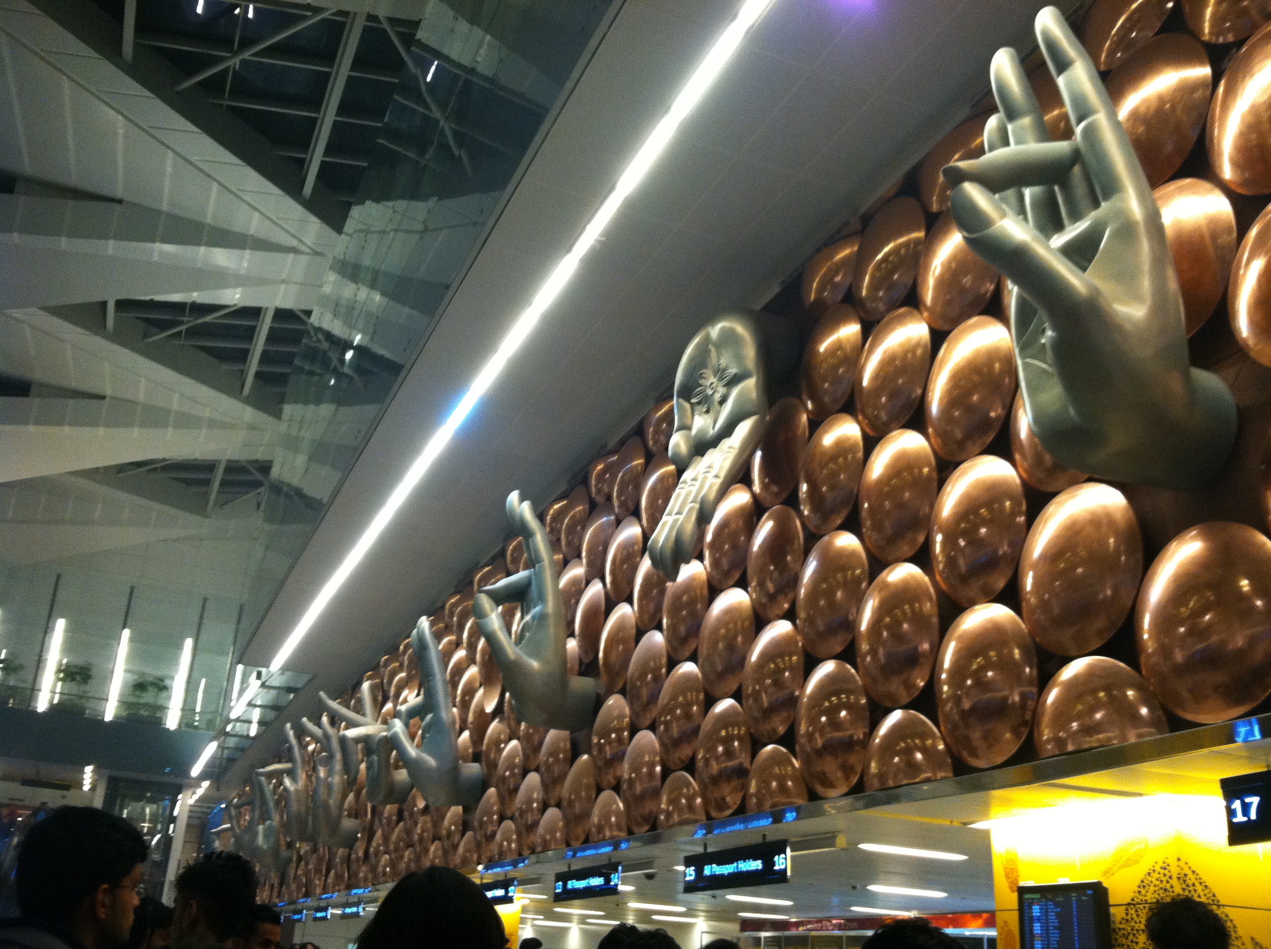 “The weather in New Delhi is currently 11 degrees Celsius and smoke.” What? I knew I was sleep deprived, but did I just hear the captain say that the weather was “smoke”? Sure enough, as I got off of the plane and walked into Indira Gandhi International Airport I was enveloped in a haze of smoke…in the building! Down in passport control it was a bit clearer. While waiting in line I was impressed with the giant hands, but had no idea what they represented.