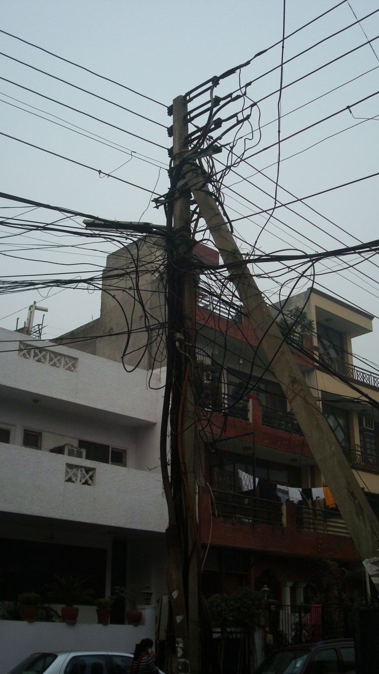 We have a love/hate relationship here in India. With the power that is. When the power is on, then everything’s great! We can run our small heater during the cool night, watch tv, surf the internet, etc. etc. The only inconvenience, albeit small, is that we have to turn off our refrigerator if we want to cook on our hot pad. Like I said, a small price to pay. The only problem is that the power goes off at least once a day, usually it’s more like 2 or 3 times. It’s not a problem during the day, I’ve got plenty to do that doesn’t require anything more than a book, pencil or paper. It’s during the evenings when we’re forced to do everything by candle or flashlight that it becomes irritating. Although, I guess we shouldn’t be surprised. About every 40 feet throughout the neighborhood stands a power line, and they’re all…shall we say, crowded…