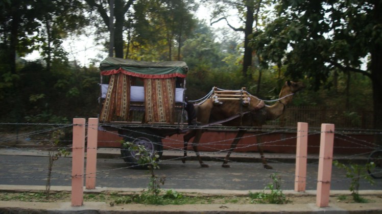 In an attempt to reduce pollution a law as been passed saying that no motor vehicles can come within so many feet of the Taj, so camels, bikes, and horses are used to transport those visitors not wanting to walk the mile down from the parking lot.