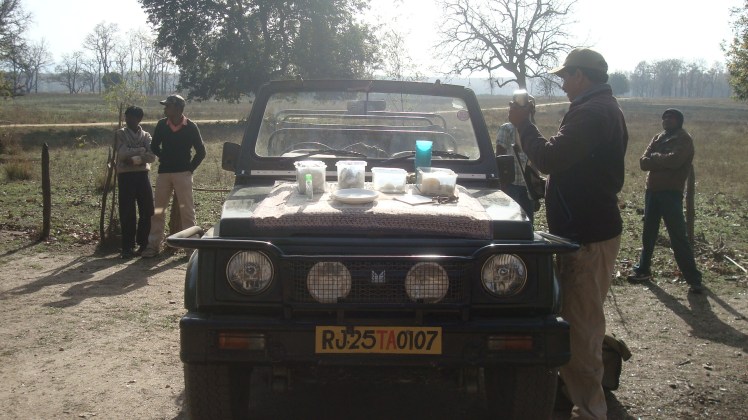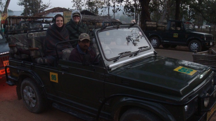 It’s 5:15 in the morning and Britt and I are flying down the main road to Kanha National Park in an open-top safari jeep. The crisp 45 degree air is stinging our cheeks, but other than that we remain warm because our thoughtful guides have given us blankets to bundle up with. The park doesn’t open until 6:30, but with several jungle camps in the area we have to get to the gate and steak out a place in line. So, leaving Kipling Camp at 5:15 and taking the 5 minute drive to the park gate, that leaves us with over an hour to sit in the jeep. Our guides told us to go ahead and sleep, but we’ve just been whipped through cold air for 5 minutes and we’re about to go on a tiger safari! We’re too excited to sleep!