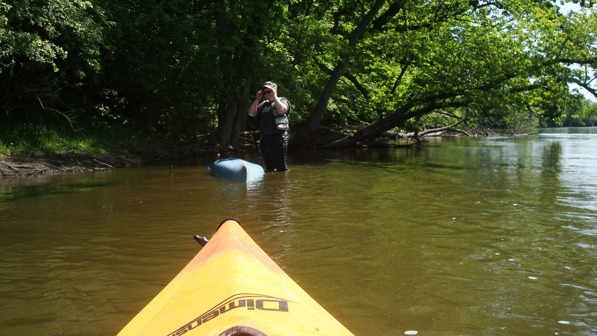 Now, we were both going slightly faster than the speed of smell at this point, so I was utterly baffled at how Britt managed to go crashing into the water and flip her kayak. Thank goodness it was shallow at this point in the river, because the Fox is known to have some wicked under-currents that have claimed the lives of many people. After the initial shock and laughter died down, Britt explained that a submerged tree branch had caught her boat from the under-side and one thing led to another and the next thing she knew she was in the water and her boat was upside down. I got out of my boat to help Britt with hers, and it turns out that it’s much easier to get/fall out of a kayak than it is to get one right-side up and get back in one. By the time we were both upright and in our boats, we were completely soaked and covered in mud. On with the trip.