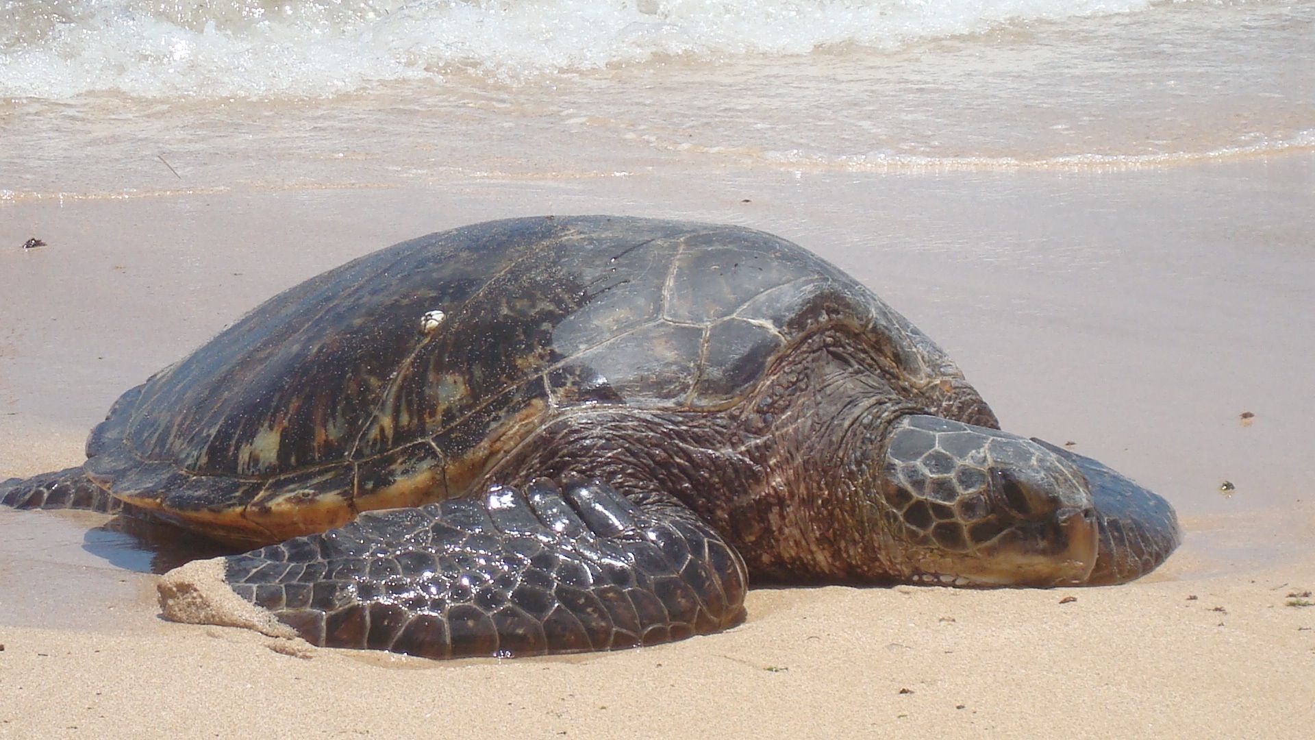 The gentle and slow-moving, but enormous sea turtles beach themselves on Laniakea Beach to soak in the warm Hawaiian sun. There were two beached when we arrived, but looking out you could see several riding the surf along the shore. Humans are required to stay at least 6 feet away from the turtles, and there were volunteers from the Sea Turtle Conservation along the beach making sure that rule was enforced.