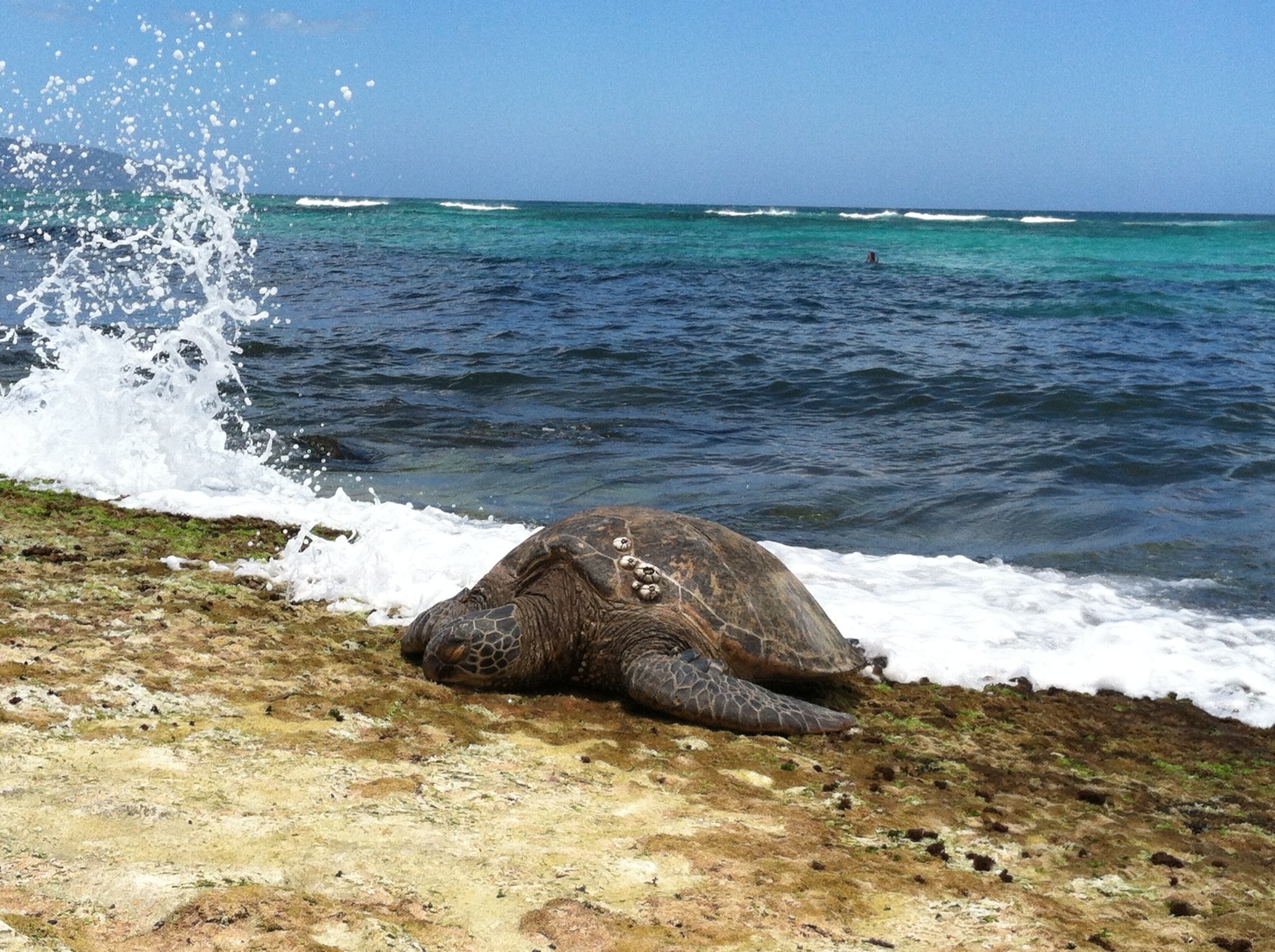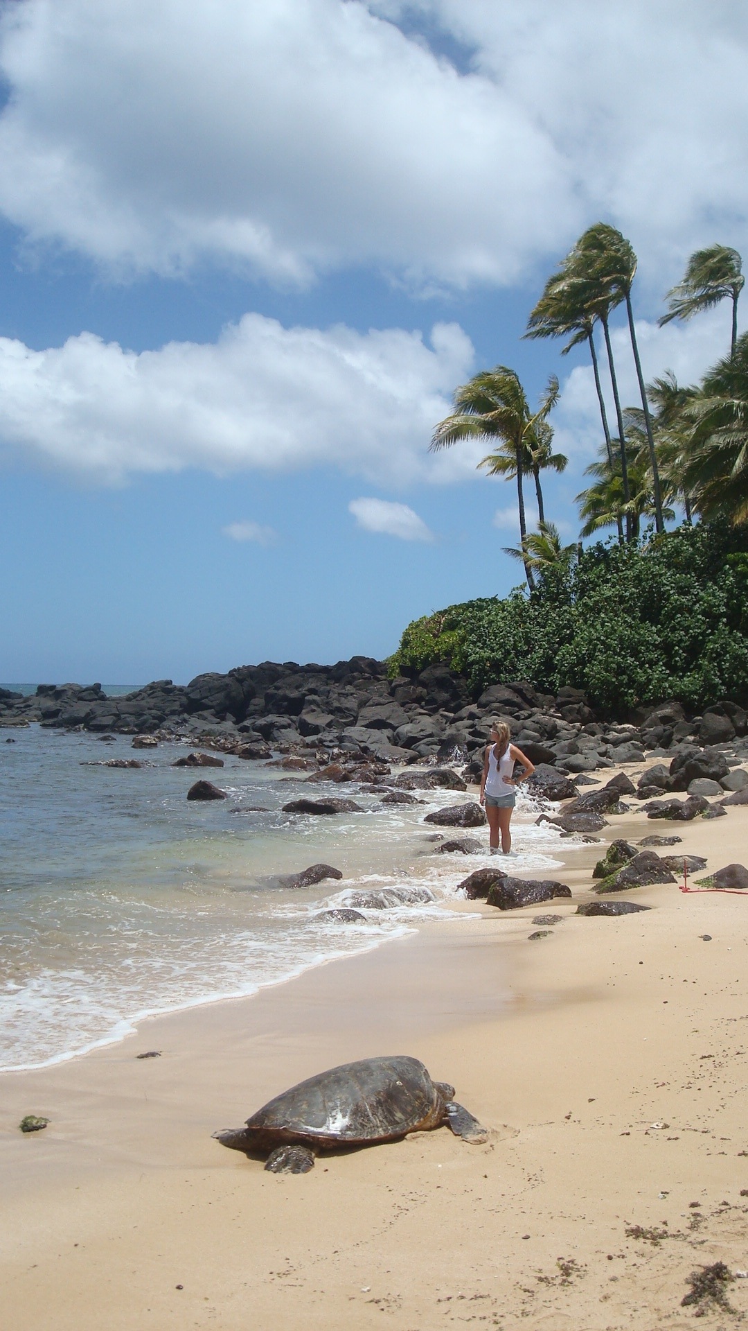 Along the North shore of Oahu are several popular beaches, but for different reasons. There are beaches with enormous/violent looking waves that are popular with surfers. There are beaches that are staked out with enormous/violent looking fishing poles that I’m assuming pull in fish that are equally enormous/violent. We were looking for something enormous, but not so violent…