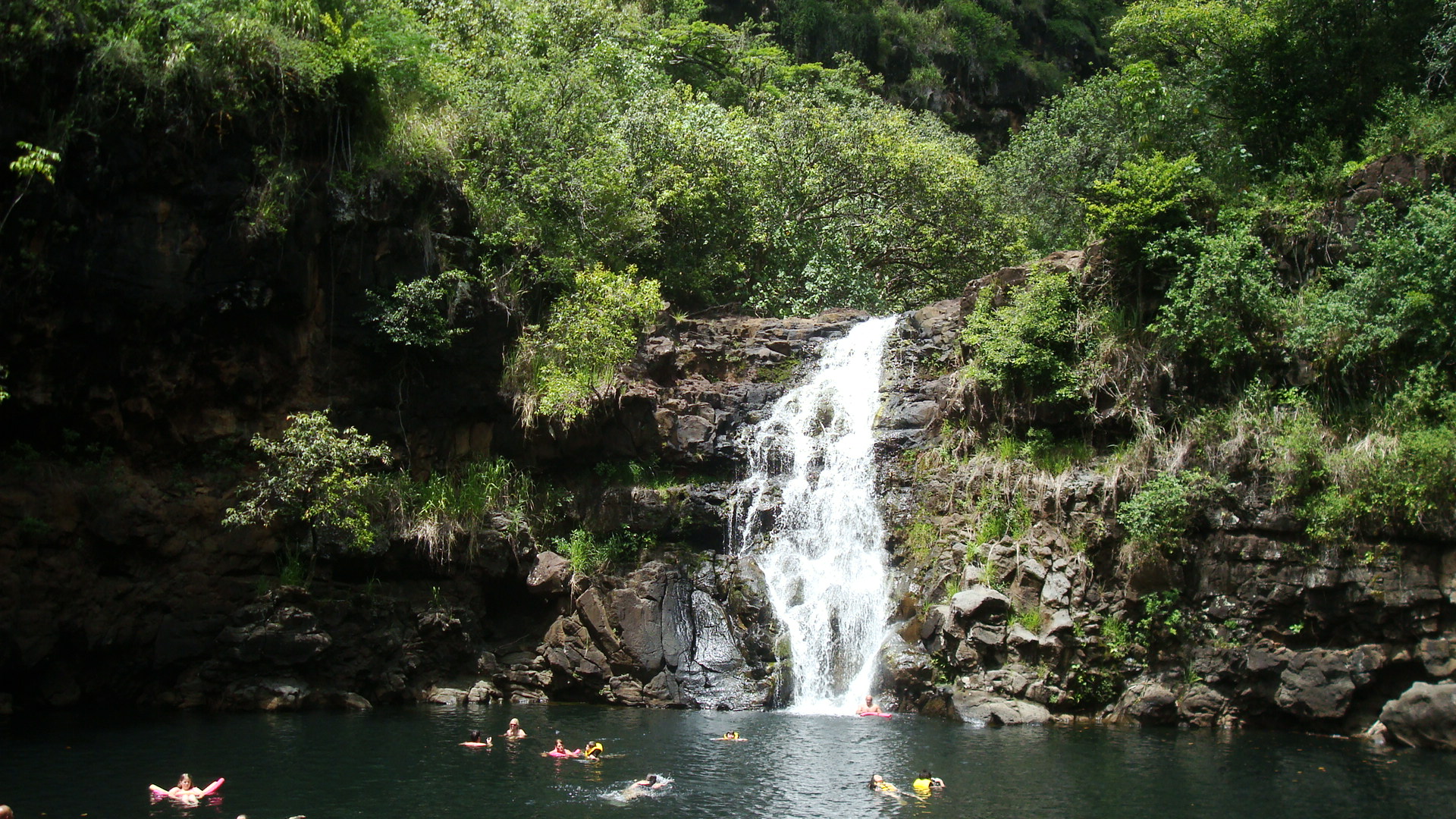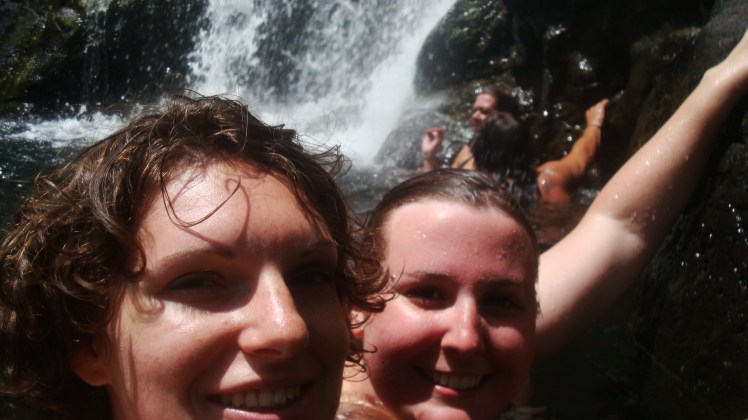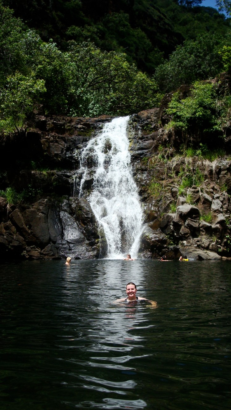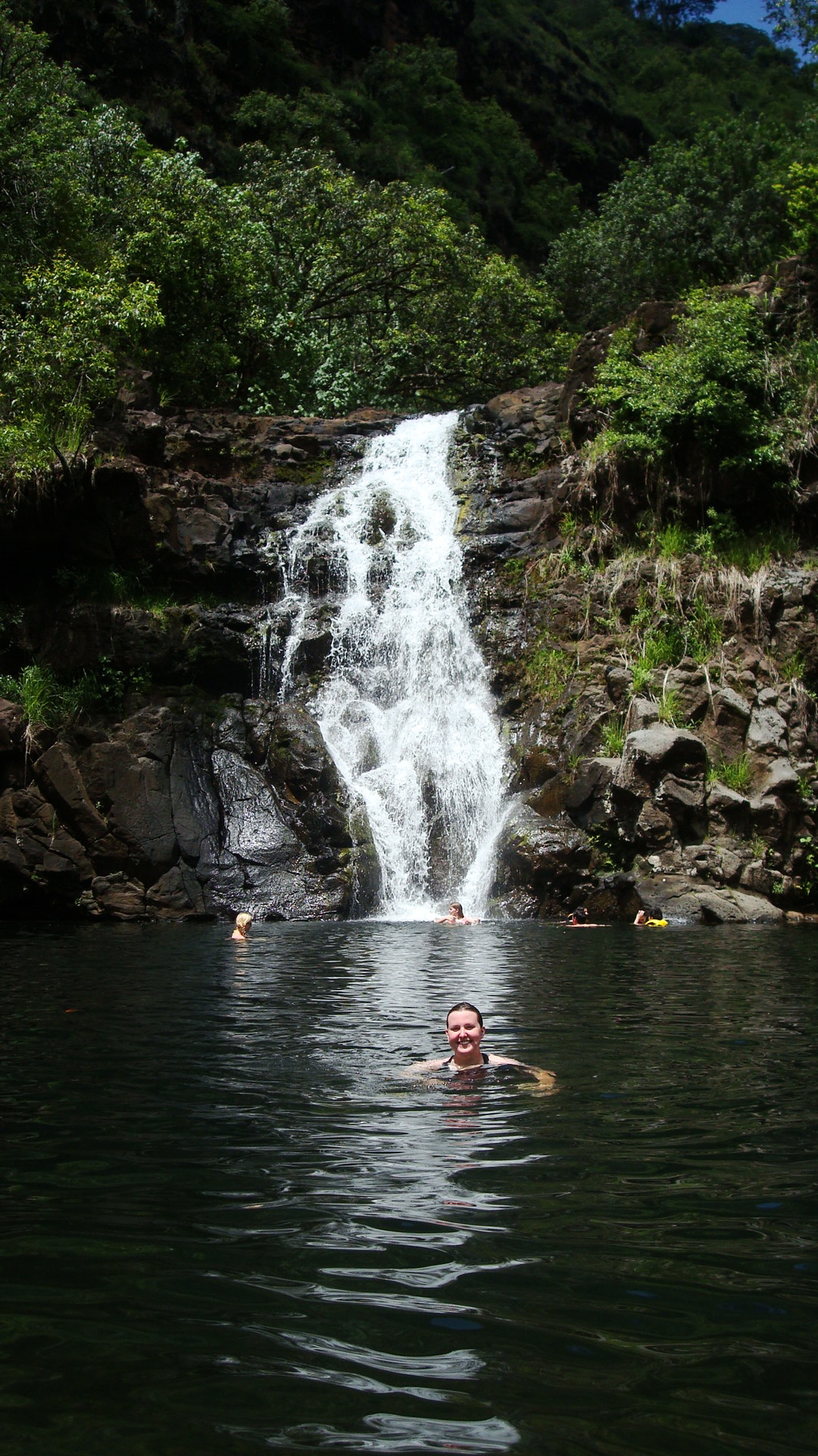 Perhaps it’s because the few movies I’ve seen that take place in Hawaii always involve people swimming in an incredibly remote pool with a gorgeous waterfall. I never gave a second thought to the actors who were having the time of their life swimming around in that exotic pool, that is until I set foot in it. The first hurdle you have to jump over at Waimea Falls are the incredibly sharp rocks that surround the pool. So, swim shoes are required, which are not the most fashionable accessory, and you can bet your bottom dollar that you won’t see the actors in the movies wearing them. Second, because the water is running down from the mountains it’s absolutely freezing! Britt was able to work up the nerve to jump in and get over it…