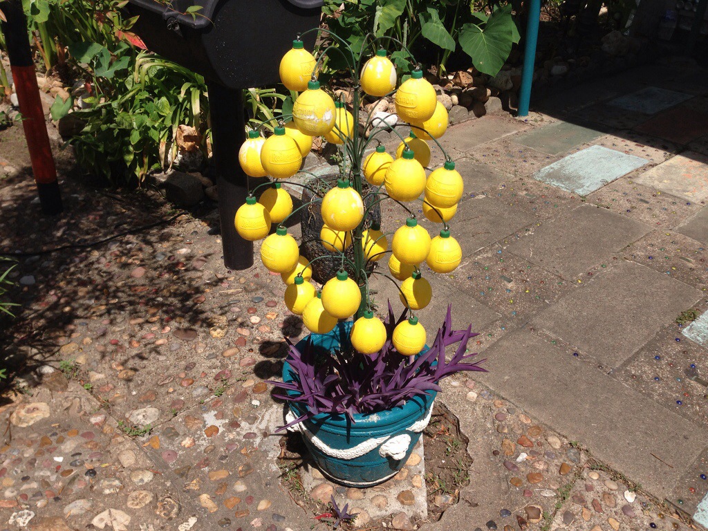 When asked about how she felt about the remodeling of her house, Mary said that so long as John didn’t bother the inside of the house she was fine with it. However, she did end up making her own contribution to the outside of the house, and it just so happens to be my favorite part. Using recycled items from her kitchen, Mary “planted” a lemon tree (in the right side of this photo you can see the marbles John placed on the sidewalk).