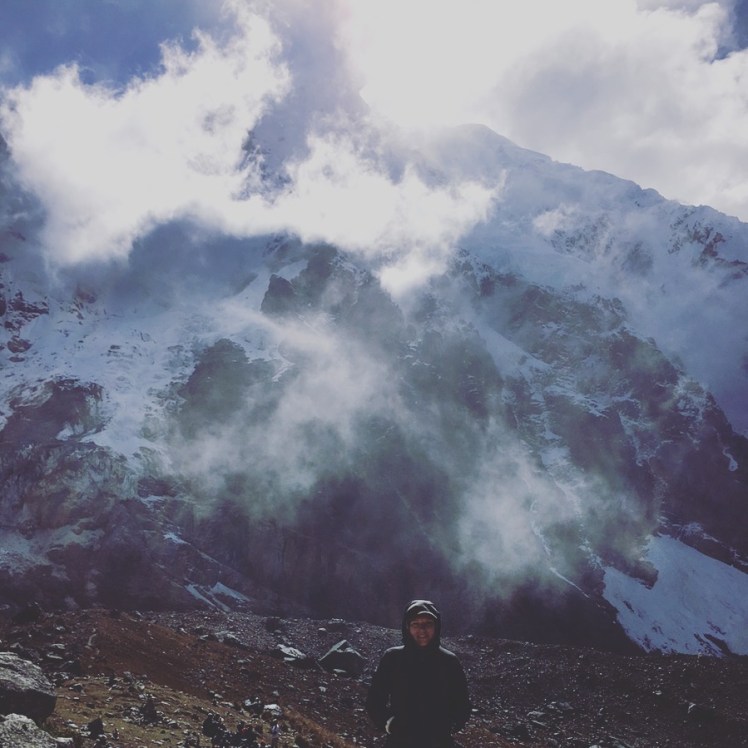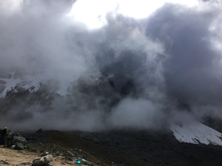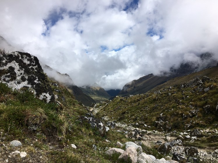 Back to the summit. I was finally beginning to feel better, the rest of the group was starting to fade and we still had 8 hours to go before nightfall. I said, ‘adios’ to Jose and his horse before we soaked in one last glimpse of the peak and then began our way down Salkantay’s backside. The trial down was so much easier on the lungs, than the hike up, however it was pretty rough on the knees. I use the term ‘trail’ very loosely here, for it was less following a defined path and more of a general scramble in a downward direction over boulders and through literal clouds. These weren’t low hanging clouds, we were just that high up!