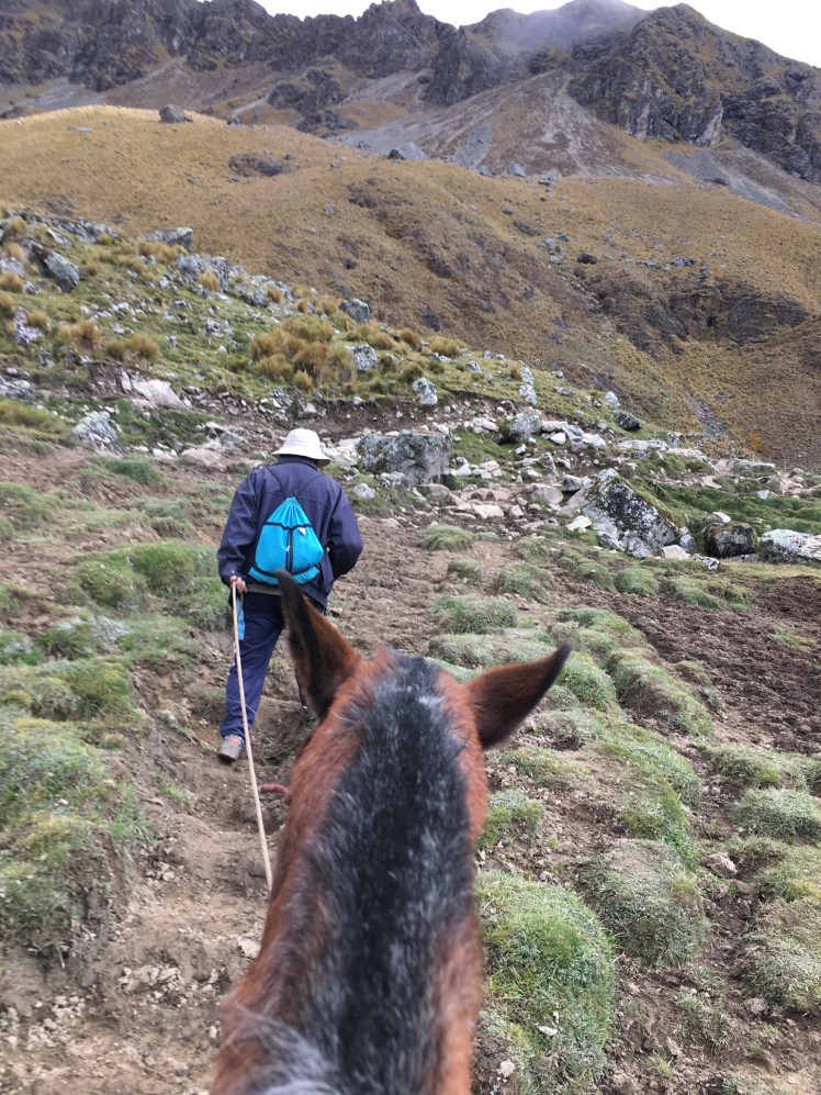 As I mentioned earlier, the Peruvian people tend to be on the smaller side, and this rang true for their horses as well. The horse I was to ride was barely bigger than a donkey, and he was equipped with a prosciutto-like saddle (thinthinthin leather) and some hand-forged stirrups that were obviously made for a short person with short legs. While I am short, my legs are not, and here in Peru – for the first time in my life – I was considered tall! Jose, the horseman, tied a loose rope around the horses neck and guided him alongside a boulder where I climbed up and mounted the animal. Because the horse was so small, the stirrups were up so high, and I was counterweighted by my backpack this was not easy feat. By the time I got adjusted on the saddle my knees were up near my elbows. Another first for me; I was too big.